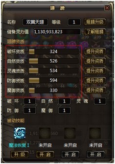 资质分为5种类型,分别为:破坏资质、自然资质、灵魂资质、防御资质、魔御资质,不同的资质将决定翅膀升级后每项属性的成长。对应资质越高翅膀每次升级增 长的对应属性会越高,每项资质区间为0-2800。资质与属性之间的算法为:翅膀每升一级,增加对应资质/1500属性点(小数后的属性将不会显示在属性 中)